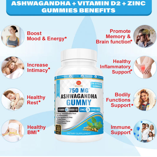(2 Pack) Ashwagandha Supplements Gummy with Ashwagandha Root Vitamin D2 + Zinc Thyroid Support for Weight Loss Focus Supplement Cherry Flavor 30 Count