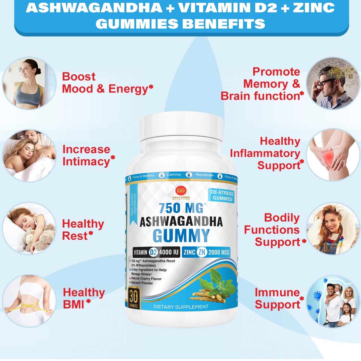 Discover the remarkable synergy of our Brain and Focus supplements Cherry Flavored Ashwagandha Root Gummy with Zinc and Vitamin D2. Expertly formulated with an optimal blend of natural ingredients to nourish your mind, improve concentration, and unleash your cognitive potential.