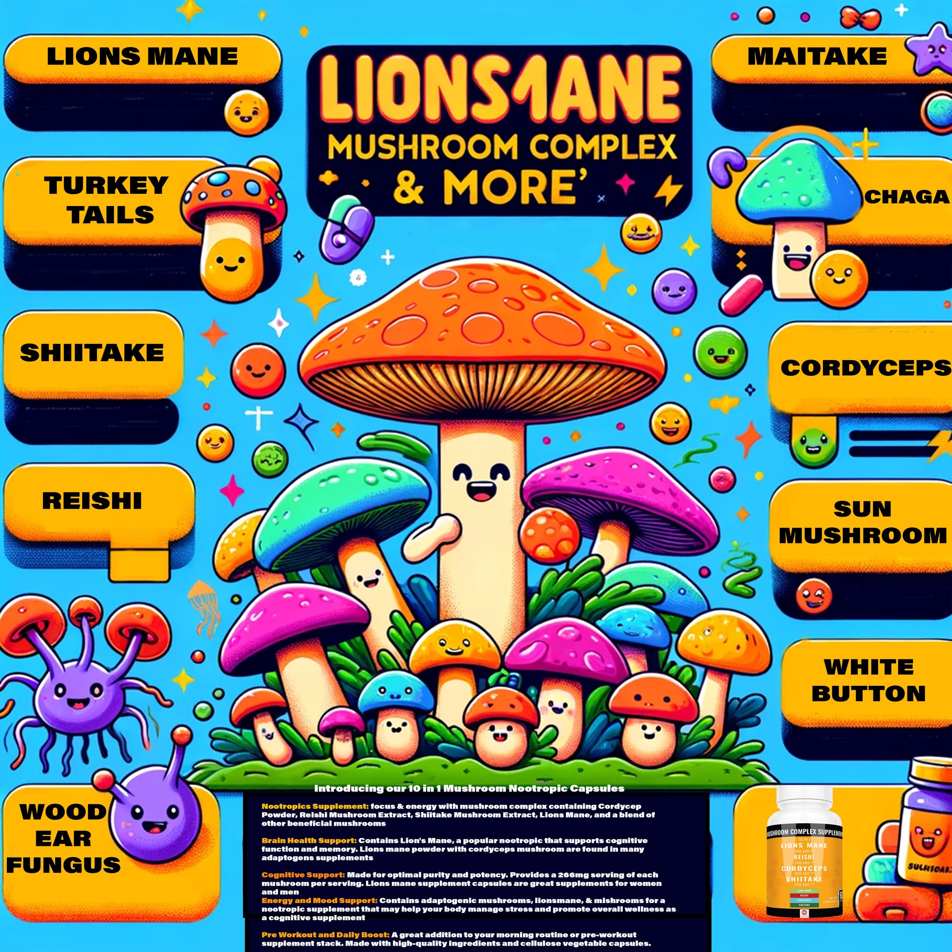 It also contains a blend of other beneficial mushroom powder, including Maitake Mushroom Extract, Turkey Tails Extract, Chaga Mushroom Extract, Sun Mushroom Extract, White Button Mushroom Extract, Turkey Tail Mushroom powder, reishi mushroom powder organic, and Wood Ear Fungus Extract. These adaptogenic mushrooms within this mushrooms supplement may help your body manage stress and promote overall wellness. Many people refer to this type of a product as a memory supplement for brain. Lionsmane mushrooms, mane and tail, are functional mushrooms.